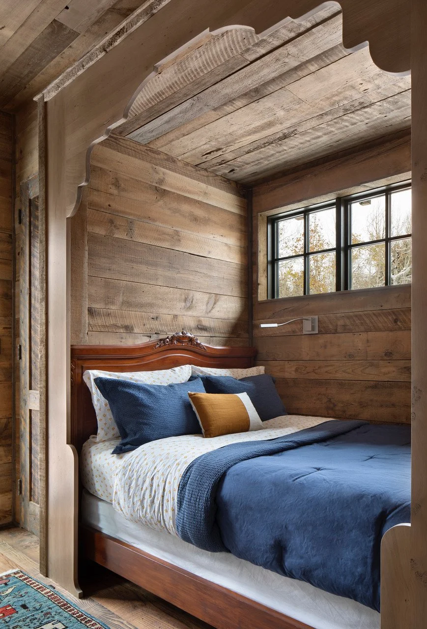 The Elk Refuge mountain home uses design to provide luxurious spaces for the homeowners and their guests to get away from it all. This sleeping alcove tucked away with beautiful accent trim, private lighting, and rustic wood surrounds the guest in the quiet solitude of the mountains. This is a perfect example of the unique ways we personalize the home designs to meet our clients needs.